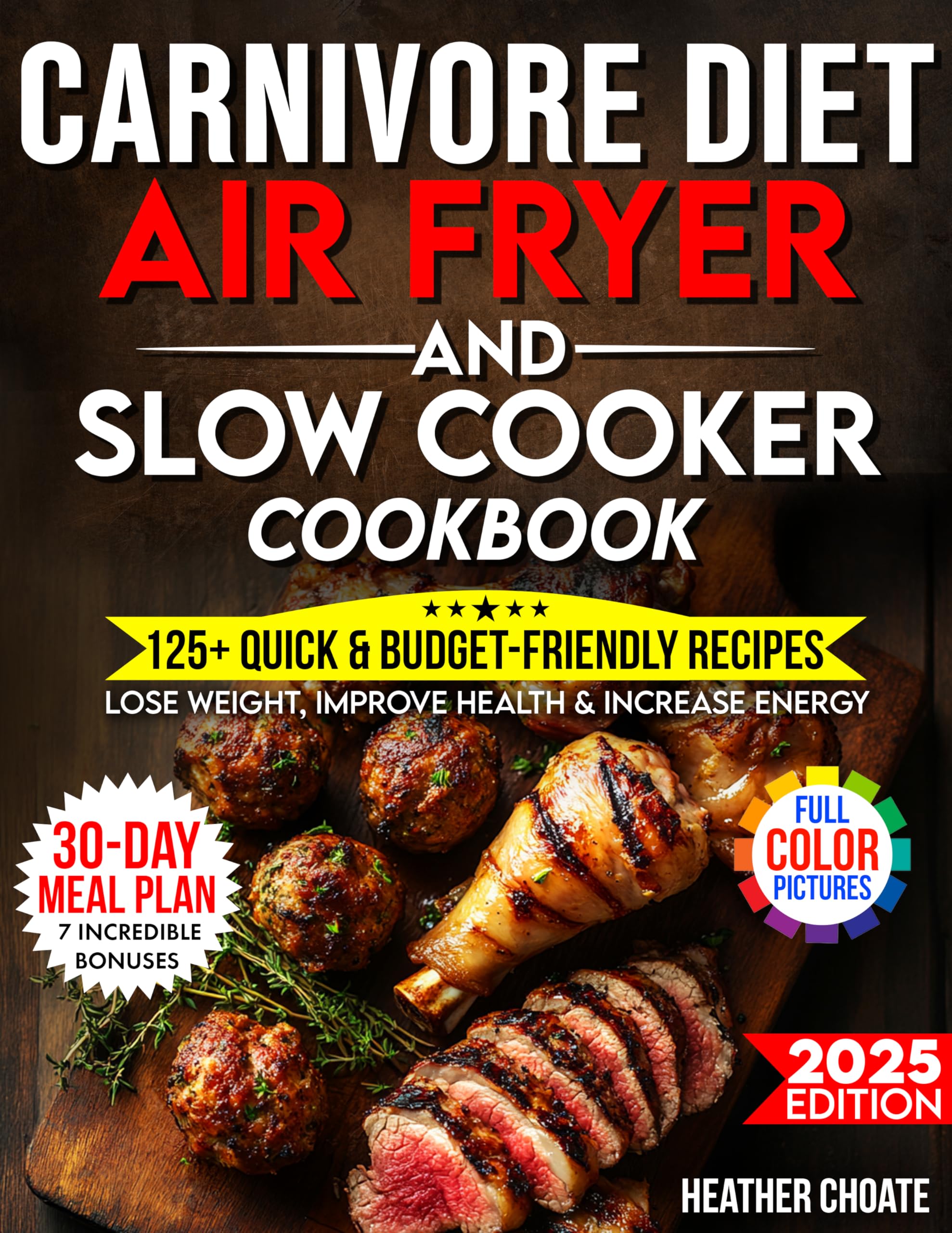 đ„© Updated 2025 Edition â đȘ 7 Carnivore Bonuses To Super-Charge Your Resultsđ„ The Carnivore Diet Air Fryer & Slow Cooker Cookbook: Fast, Easy & Affordable Meat-Based Meals For Weight Loss, Energy & Healthđ From #1 Bestselling Author Heather Choateđ Packed with 150+ Air Fryer & Slow Cooker recipes, a 30-day carnivore meal plan, and exclusive bonus guidesâthis sequel to the #1 Amazon bestseller Carnivore Cookbook for Beginners on a Budget makes carnivore eating faster, easier, and more affordable than ever. From crispy bacon-wrapped chicken to buttery slow-cooked roasts and zero-carb âfat-bombâ snacks, enjoy real food, real flavor, and real resultsâwithout stress or overspending.đ Written by #1 Bestselling Author Heather ChoateMom of eight, cancer survivor, and budget-savvy homemaker, Heather proved that high-protein healing can be simple, satisfying, and sustainable. Her first carnivore bookâwith a foreword by Dr. Ken Berryâbecame the #1 bestselling carnivore cookbook on Amazon. Now sheâs back with even more family-friendly, budget-smart recipes for everyday success.â In This Carnivore Air Fryer & Slow Cooker Cookbook Youâll Discover How To:Cook delicious meat-based meals in minutes with foolproof air fryer and slow cooker techniquesLose weight and boost energy while eating foods you actually love (yesâsteak, bacon & butter!)Save time with hands-off meals that practically cook themselves while you work or restSpend less than $7 per day with smart shopping tips and budget-friendly cutsFeed the whole family with kid-approved favorites like burger bites & egg roll-upsMaster the art of flavor and fat balance for satisfaction that lasts all dayđœïž Whatâs Inside:150+ Air Fryer & Slow Cooker recipes â no repeats or bland basics30-day carnivore meal plan with printable grocery lists (free PDF bonus)18 beef dishes18 pork favorites18 chicken & poultry meals14 seafood recipes19 egg-based meals12 fat-boosting tallow treats29 slow-cooker comfort mealsSmart shopping & prep guides to keep you under budget every weekAccess to Heatherâs free high-protein mini video series for step-by-step confidenceđĄ This Book Is For You If:You want to lose weight naturally without counting calories or macrosYouâre tired of complicated plans and need simple real-food solutionsYou love carnivore or keto but need fast air fryer or slow cooker shortcutsYouâre on a tight budget and still want premium-tasting mealsYou want to feel energized, strong, and satisfied every single dayđ„ Scroll To The Top And Get Your Copy Now!If you loved the #1 bestselling carnivore cookbook on Amazon that started it all, this sequel takes it even furtherâcombining convenience, affordability, and incredible flavor in one powerful kitchen guide.đ If you want fast, budget-friendly, high-protein meals that actually make carnivore simple and delicious, scroll to the top and get your copy now!