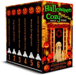 SIX spooky Halloween cozy mysteries all in one boxed set! Fall is in the air and so is murder. Halloween can be deadly. Over 1,000 pages of reading! Spooky humor with a side of homicide!From New York Times Bestseller, USA TODAY, & Wall Street Journal bestseller Addison Moore and her partner in cozy crime, USA TODAY Bestseller Bellamy Bloom!Cosmopolitan Magazine calls Addison’s books…easy, frothy, fun!Boxed Set includes:Killer Halloween Cupcakes (Murder in the Mix)Dog Days of Murder (Country Cottage Mysteries)Haunted Halloween Murder (Meow for Murder)Panama Canal Killer Cruise (Cruising Through Midlife)Murder for Beginners (Brambleberry Bay Murder Club)Double Double Recoil & Trouble (Pain in the Assassin Cozy Mysteries)Get ready to have a Spooktacular good time!Killer Halloween Cupcakes (MURDER IN THE MIX Mysteries) A baker who sees the dead. One too many suitors.And a killer. Living in Honey Hollow can be murder.Dog Days of Murder (Country Cottage Mysteries) An innkeeper who reads minds. An ornery detective. And a trail of bodies. Cider Cove is the premier destination for murder.Haunted Halloween Murder (Meow for Murder Mysteries) It’s spooky season in Starry Falls and if I thought outrunning the mob was a challenge, try outrunning a killer! Cats and killers abound in this quirky cozy mystery that takes place in the coziest little town in Vermont!Panama Canal Killer Cruise (Cruising Through Midlife) It’s Halloween on the high seas! But for one unlucky passenger it will be their final voyage.Murder for Beginners (Brambleberry Bay Murder Club) It’s Halloween in Brambleberry Bay and the fine folks at the country club are about to have a spooky good time. Getting into the club was easy. Getting out can be murder.Double Double Recoil & Trouble (Pain in the Assassin Cozy Mysteries) It’s the spookiest season of all in Honey Hollow and a haunted house turns into a horror as Effie stumbles upon a real body.