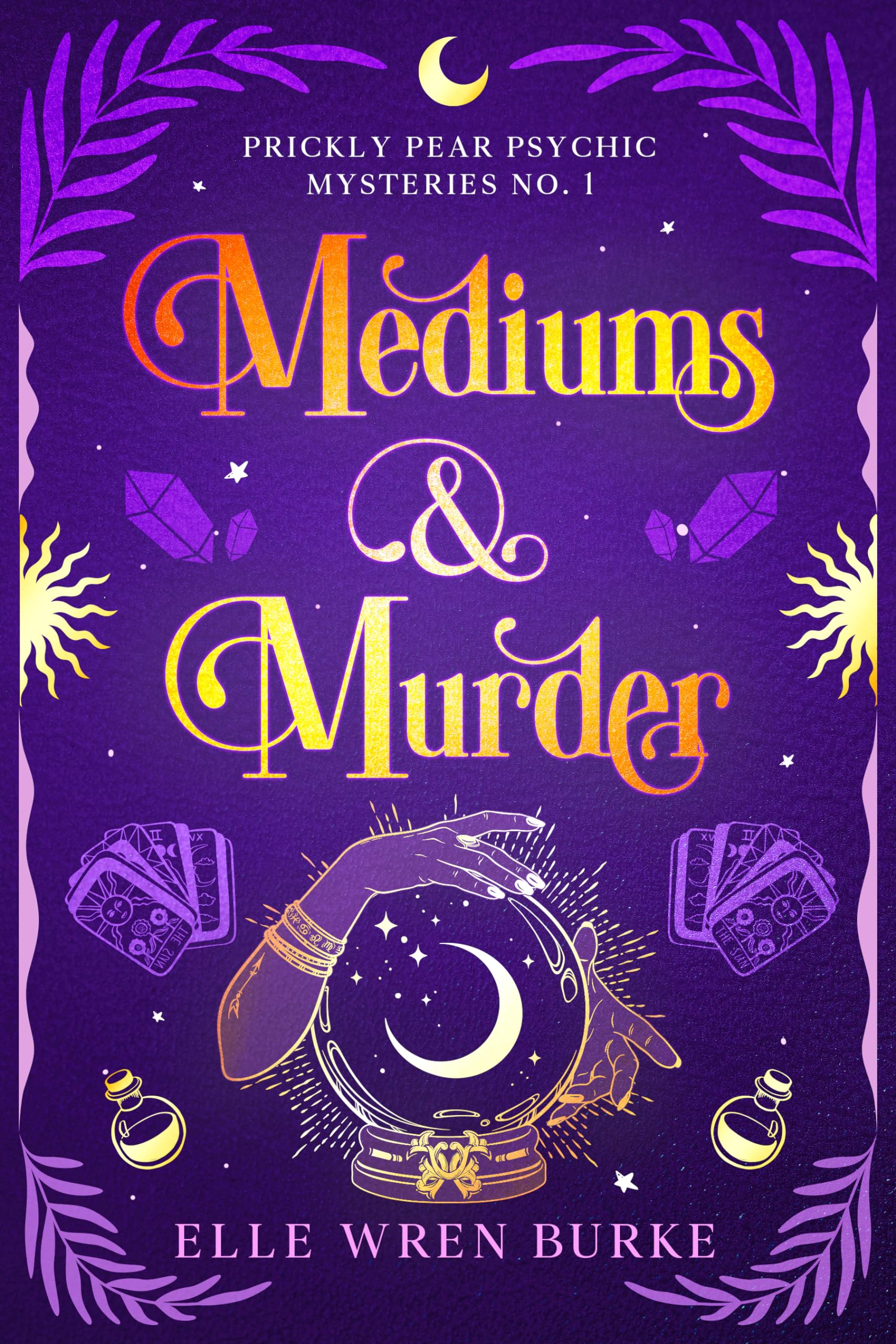 “Fans of Victoria Laurie or Trixie Silvertale would enjoy this debut book in the Prickly Pear Psychic Mystery series…” ★★★★★One body, two psychics, and a tangled web of secrets and grudges have arrived in the sunny desert town of Prickly Pear, AZ.Alara leads a safe and snug life, but she has a secret—she has psychic powers that scare the hippos out of her. They’ve gone wonky before, so now she only uses them for the most important purpose—listening to her dogs ask for more treats. But on an already awful Monday morning, Alara stumbles right into a vision of the moments before her friend’s murder. Mondays are the worst, right?Alara’s powers might be able to help find the killer, but she’s more terrified than a whale in the desert, and it’s not like she has a dusty old crystal ball to produce visions on demand. Just as she’s feeling completely befuddled, Alara’s long-lost aunt arrives to tell her they both come from a long line of psychics. And she has experience investigating…Deciding to dip her toe into the case, Alara discovers one of the officers involved is her best friend’s brother, who’s much hunkier than the last time she saw him. The more Alara investigates, the more he grows suspicious. And her questions aren’t just attracting his attention—the killer is still at large and desperate to tie up loose ends.Can Alara dig deep to embrace her powers before the killer puts her six feet under?If you like amateur sleuths, humorous adventures, and charming canine companions, then you’ll love Elle Wren Burke’s mystical mystery.Dust off your crystal ball and buy Mediums & Murder today!“All of my favorite things…psychics, intuition, romance and mystery…all bound together in this spellbinding story!” ★★★★★
