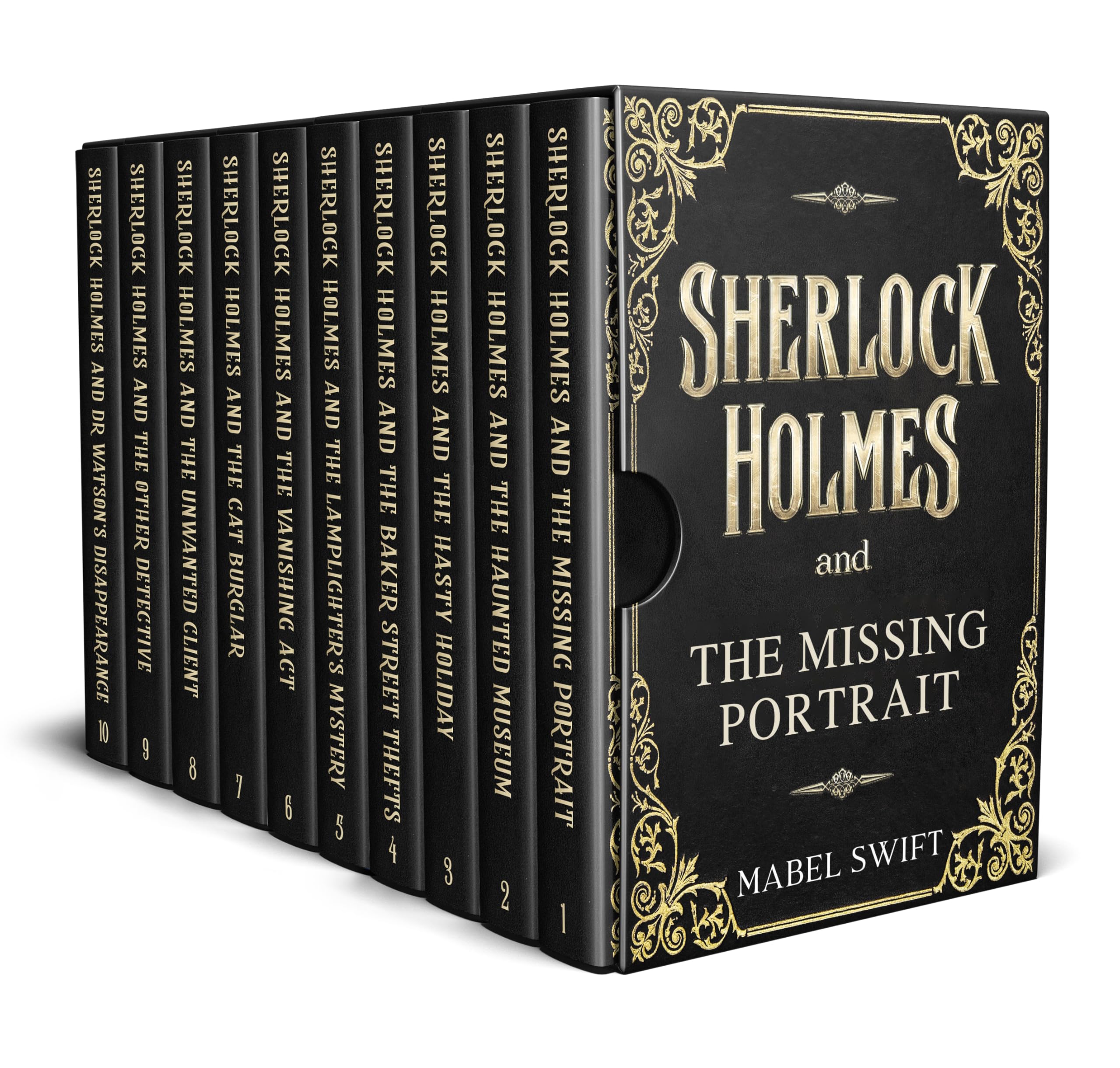 This ten-book collection brings together a series of intriguing Victorian mysteries featuring Sherlock Holmes and Dr John Watson. From a missing portrait to a magician’s impossible disappearance, each case presents Holmes with a unique puzzle to solve.As they navigate London’s dark alleys and grand estates, the great detective and his loyal friend uncover deception, face unexpected adversaries, and use their sharp intellect to reveal the truth.Perfect for fans of classic detective fiction, these stories capture the spirit of Holmes’ investigations in thrilling detail.Book 1 – Sherlock Holmes and The Missing Portrait – A noblewoman’s commissioned portrait depicts a stranger in her home, leading Holmes to a tangled web of deception.Book 2 – Sherlock Holmes and The Haunted Museum – A wax museum is plagued by eerie disturbances, but Holmes is certain that a very human hand is at work.Book 3 – Sherlock Holmes and The Hasty Holiday – A woman’s sudden holiday seems too convenient, and Holmes suspects she has been lured into danger.Book 4 – Sherlock Holmes and The Baker Street Thefts – Valuable trinkets vanish from homes on Baker Street, but the thief leaves no signs of forced entry.Book 5 – Sherlock Holmes and The Lamplighter’s Mystery – A lamplighter’s job is sabotaged by a ruthless rival, but Holmes suspects a darker motive.Book 6 – Sherlock Holmes and The Vanishing Act – A famous magician disappears mid-performance, and Holmes must determine whether it was illusion—or murder.Book 7 – Sherlock Holmes and The Cat Burglar – Priceless objects vanish without a trace, forcing Holmes to match wits with an exceptionally cunning thief.Book 8 – Sherlock Holmes and The Unwanted Client – A fortune-teller seeks Holmes’ help when his predictions start coming true—with deadly consequences.Book 9 – Sherlock Holmes and The Other Detective – A rival detective outshines Holmes, but the cases he solves seem to have a sinister connection.Book 10 – Sherlock Holmes and Dr Watson’s Disappearance – When Watson vanishes after responding to a medical call, Holmes races against time to save his dearest friend.